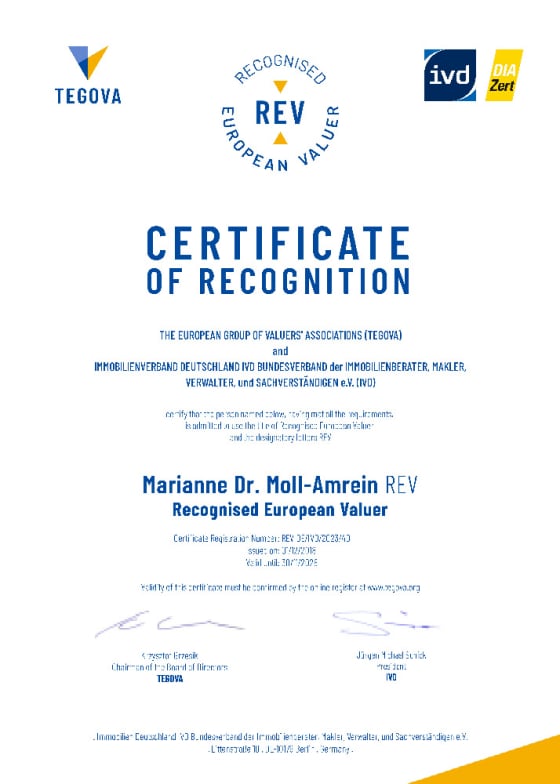Zertifikate der „TEGoVA“ (The European Group of Valuers’Associations) als „Recognised European Valuer (REV)“ sowie der DIA Consulting AG Zertifizierungsstelle (akkreditiert nach DIN EN ISO/IEC 17024) für den Nachweis der Kompetenz als „Zertifizierte Sachverständige für Immobilienbewertung (DIAZert) für die Marktwertermittlung gemäß ImmoWertV und Beleihungswertermittlung gemäß BelWertV aller Immobilienarten (F)".