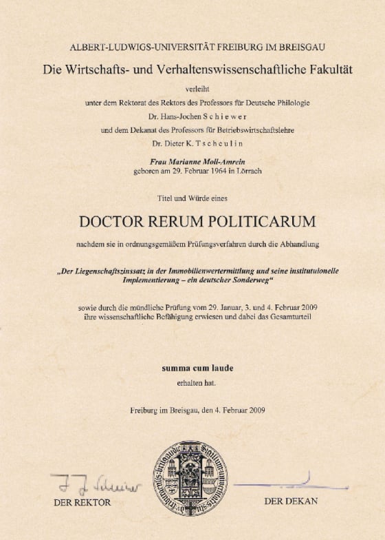 Die Promotion erfolgte 2009 „summa cum laude“. Meine Dissertation mit dem Thema „Der Liegenschaftszinssatz in der Immobilienwertermittlung und seine institutionelle Implementierung – Ein deutscher Sonderweg“ wurde mit dem DIA Forschungspreis ausgezeichnet.