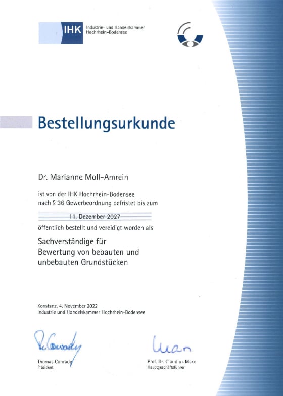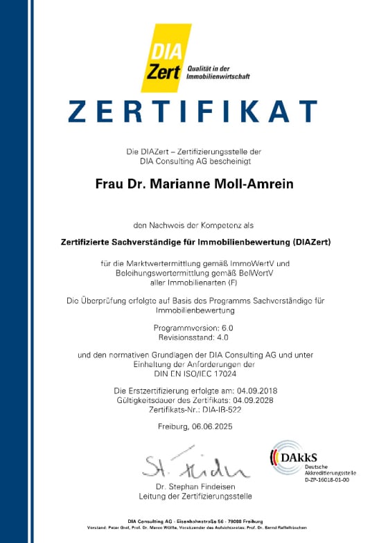 Zertifikate der „TEGoVA“ (The European Group of Valuers’Associations) als „Recognised European Valuer (REV)“ sowie der DIA Consulting AG Zertifizierungsstelle (akkreditiert nach DIN EN ISO/IEC 17024) für den Nachweis der Kompetenz als „Zertifizierte Sachverständige für Immobilienbewertung (DIAZert) für die Marktwertermittlung gemäß ImmoWertV und Beleihungswertermittlung gemäß BelWertV aller Immobilienarten (F)".