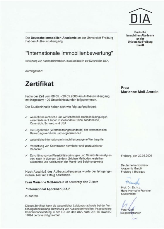 Durch den 2006 von mir absolvierten Aufbaustudiengang bei der DIA erfolgte die Ausweitung auf Kenntnisse der Immobilienbewertung auf internationalen Märkten.