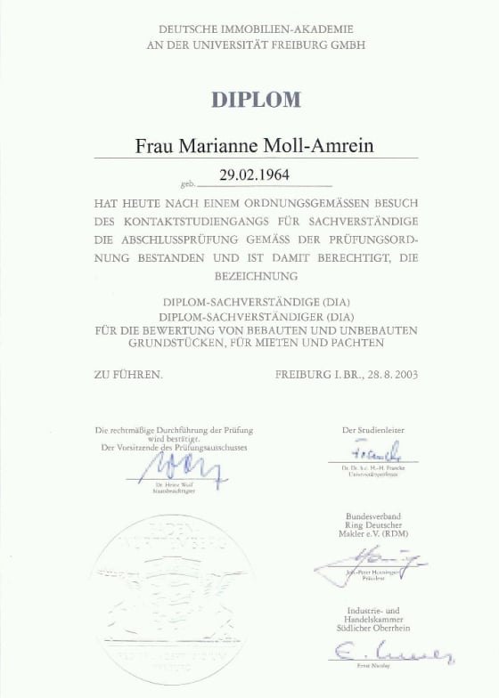 Der 2003 von mir absolvierte Studiengang der Deutschen Immobilien-Akademie an der Universität Freiburg (DIA) mit diesem Abschluss stellt eine fundierte Ausbildung im Bereich der Wertermittlung dar. Der Studiengang wird auch aktuell von der DIA mit großem Erfolg angeboten.